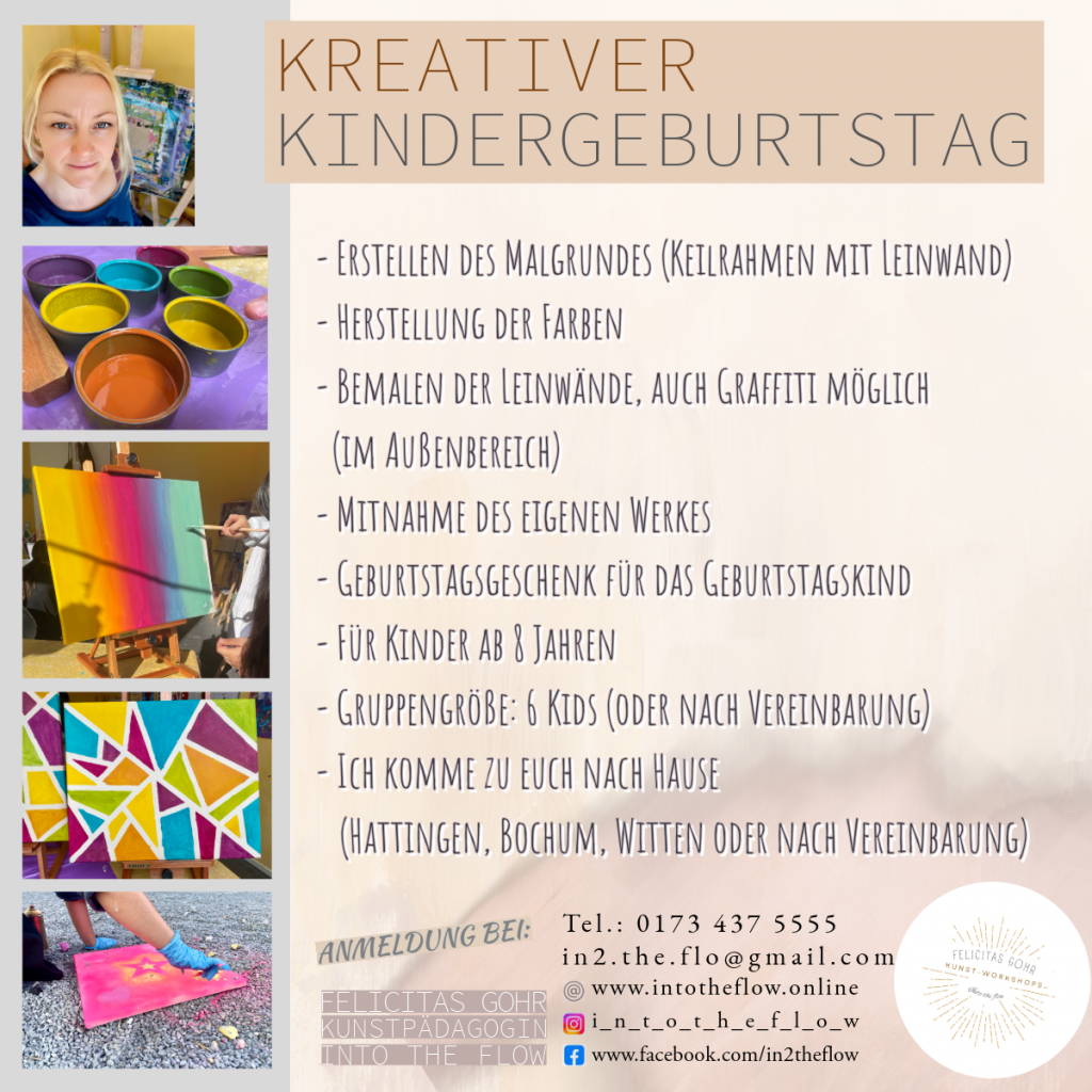 Das Flow-Feeling Ein Zustand, der sich im eigenen kreativen Schaffen, beflügelt von intrinsischer Motivation und mit völliger Konzentration ergeben kann. Im Sog der Energie mitgezogen zu werden, ist ein lohnenswerter Zustand, es ist Balsam für die Seele. Du bist herzlich auf dieser Seite eingeladen, dein Flow-Feeling zu entdecken – sei es bei deinem kreativen Kindergeburtstag, bei der Unterstützung deiner kreativen Ziele und künstlerischen Ausdrucksweise oder in einen Workshop, der ein Gefühl von Freude hinterlässt.